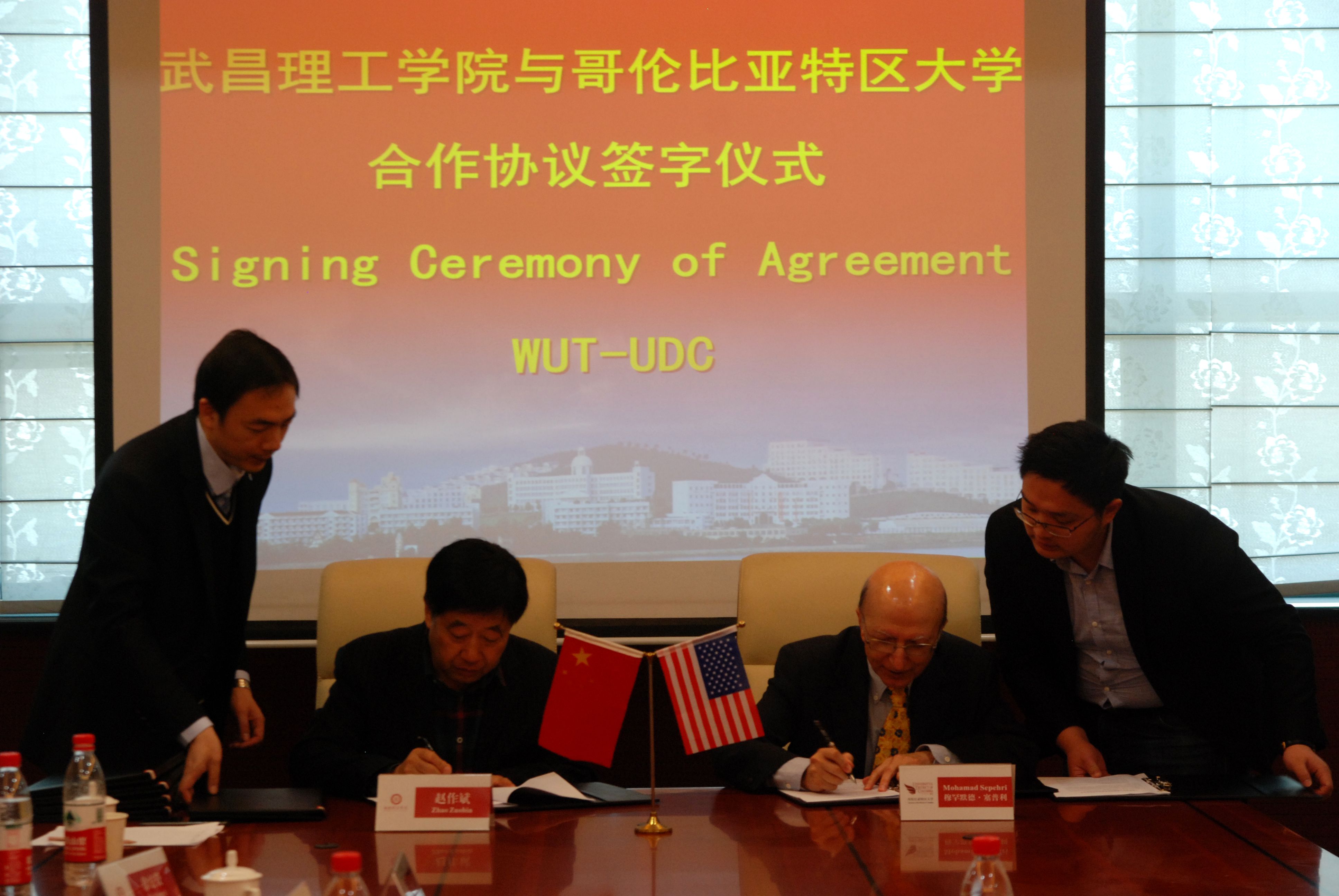 The delegation of University of the District of Columbia(UDC) leading by Dean of Business School - Mohamad Sepehri paid a visit to Wuchang University of Technology during Mar. 12th to 13th. President of WUT Prof. Zhao Zuobin with other school leaders had a warm and friendly meeting with the guests from UDC and signed an Articulation Agreement concerning 3+2 Master Degree in the majors of Business and Computer Science.